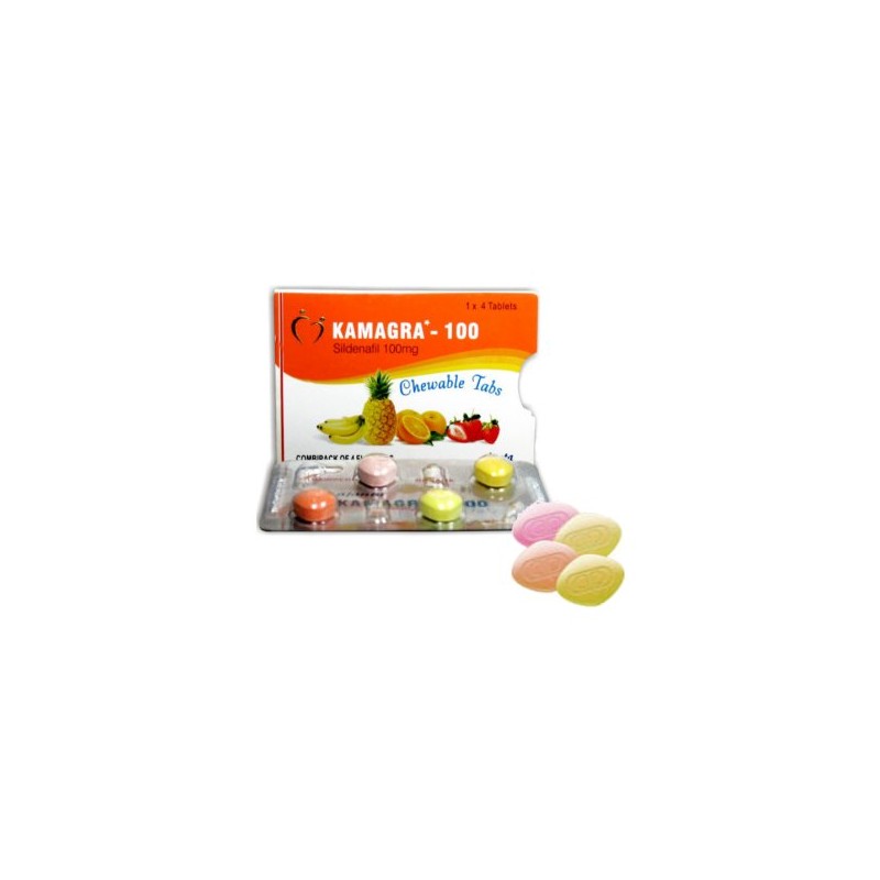 Kamagra Tabs é embalado em 4 comprimidos de 100mg com aromas: banana, laranja, morango e ananás.